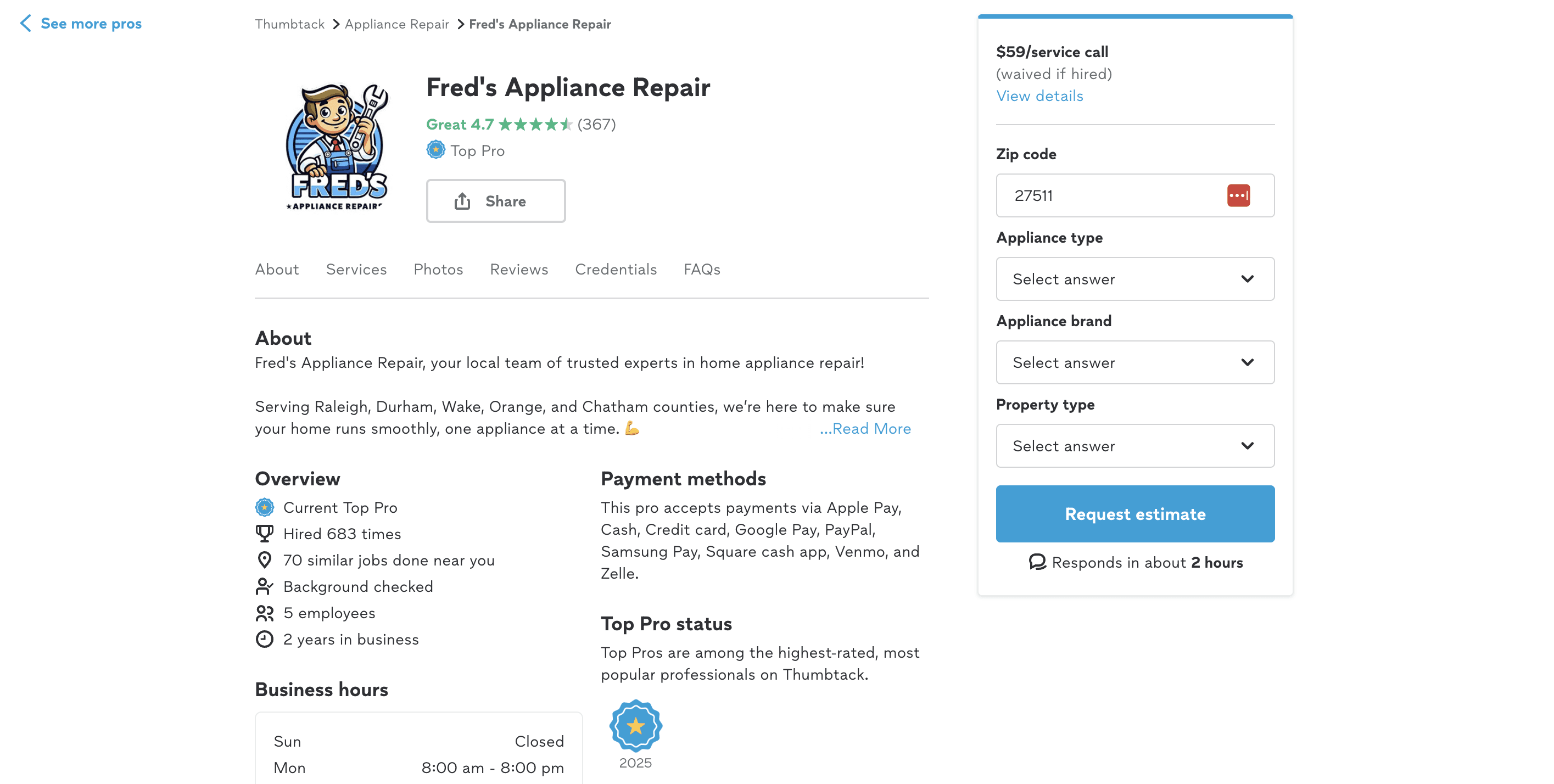 Ask about the diagnostic fee upfront. Some companies, like Fred’s Appliance, charge a flat fee for inspection and diagnosis, and it is credited toward the total repair cost if you choose to hire them.